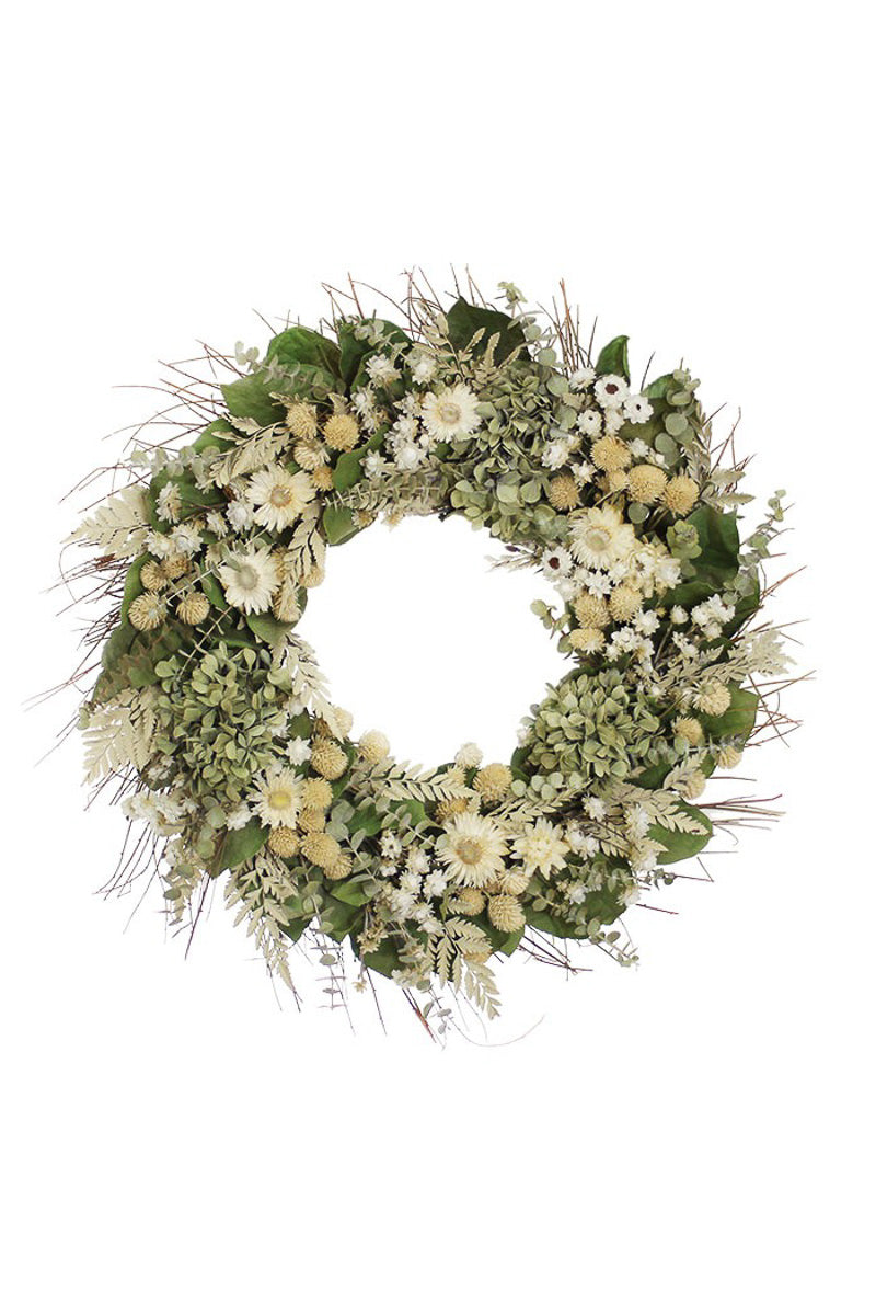 Unit price perRunning through the wild meadow is the inspiration for this wreath design. It has natural green hydrangea, cream strawflowers, daisies, cream globe, salal leaves and sage green eucalyptus. The Wild Meadow Wreath lets you bring natural indoors so you can enjoy all year round. My favorite flower in this wreath is the green hydrangea blooms.